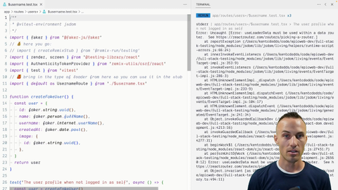 04:55 We created a RemixStub that gave us back an app. We defined the routes that we want for this test, specified our component and our path and our loader. And then instead of rendering our components, we're rendering the app. And we're still using React Testing Library to render that. The RemixStub is just creating the app