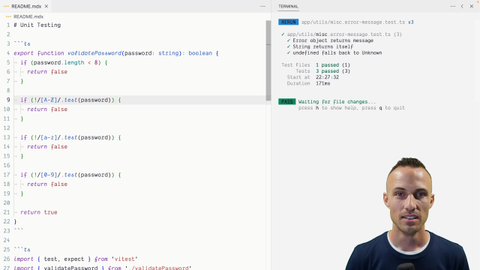 00:38 And so they can be very useful to have a special test all on its own. So if we had a validate password function like this, which, yeah, it's probably not the best. I would use Zot. Zot is a lot better for validation. But if that's what we had, then this is how you would do that. We're using VTest for doing that.